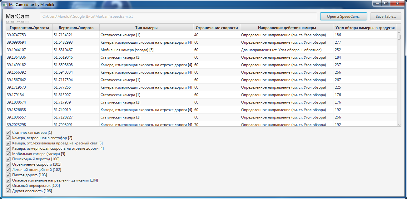 MarCam – редактор для базы системы SpeedCam, которая используется для предупреждения водителя о приближении объекту данного типа.